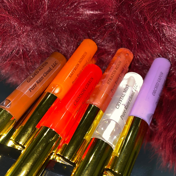 The lineup includes: Gilded Altus in vanilla, Crimson Cirrus in strawberry, Stratus Reign in watermelon, Saffron Nimbus in pineapple, Orchid Vapor in blueberry, and Crystal Mist in cotton candy.